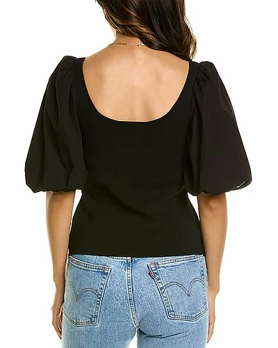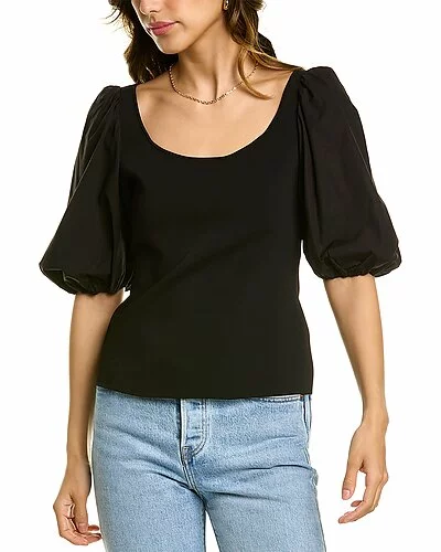 - Scoop Top in black with scoop neck, puffed elbow sleeves, and elasticized cuffs