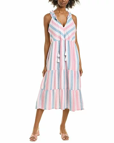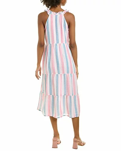 - Lena Mallory Sun Linen-Blend Midi Sundress in primevere with ruffle tie neck, side seam pockets, and tiered skirt