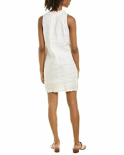 - Sandy Spots Linen Shift Dress in coconut with ruffle neckline, side seam pockets, and fringe hem
