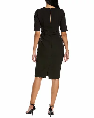 - Design details: zippered V-neck, elbow-length sleeves, keyhole back and center vent at back hem