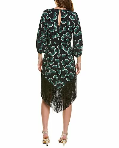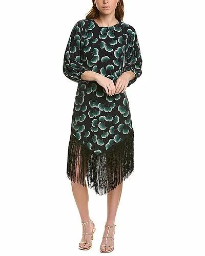 - Design details: 3/4-length balloon sleeves, fringe trim at hem