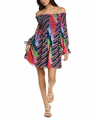 - Anza Mini Dress in multicolor with off-the-shoulder design, smocked bodice, balloon sleeves, and elasticized flounce cuffs
