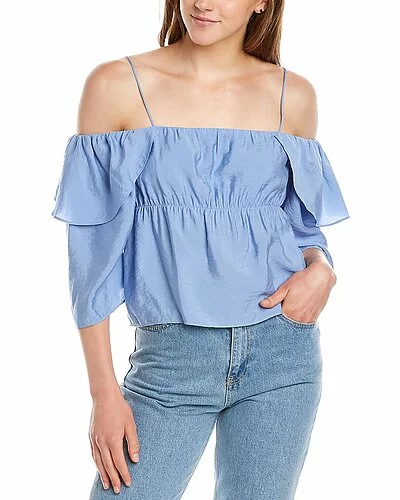 - Off-The-Shoulder Cami in vista blue with adjustable shoulder straps, elasticized neckline, and ruffle shoulders