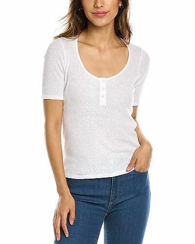 - Scoop Neck Linen-Blend Henley Shirt in optic white with ribbed knit design and scoop neck