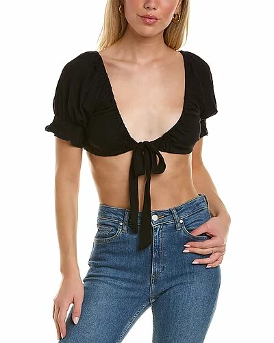 - Tie Front Bandeau Top in black with rib design, elasticized trim, and short balloon sleeves