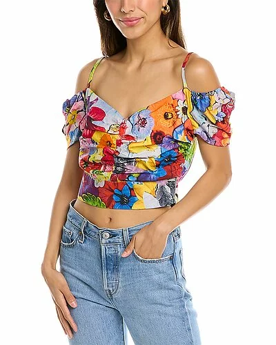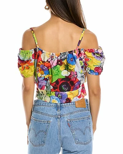 - Kinsley Top in tropical garden with adjustable shoulder straps, ruched V-neck and off-the-shoulder puff sleeves